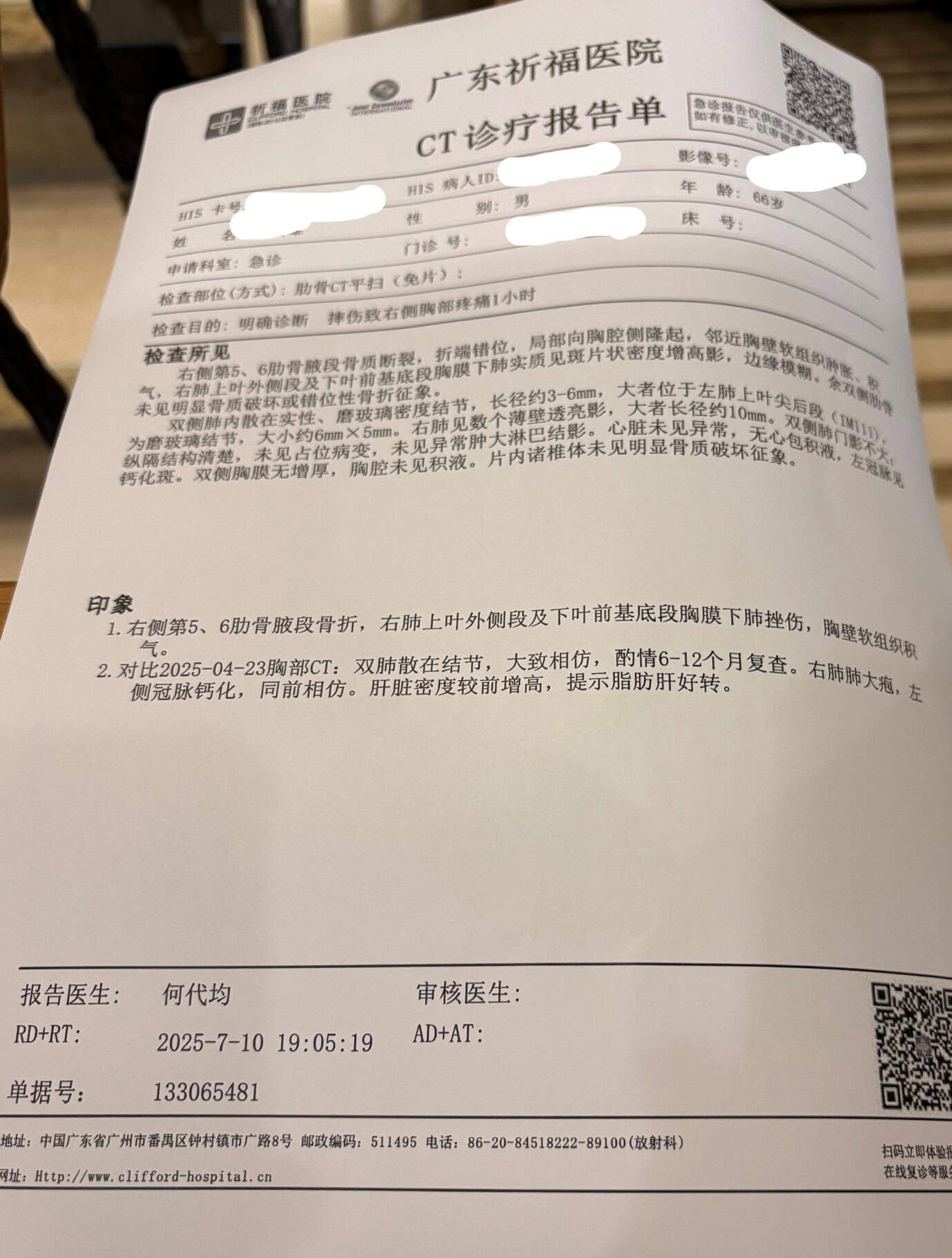 另一個病人,在廣州跌倒,撞傷右胸,急診作CT檢查診斷為右第5、6肋骨骨折。