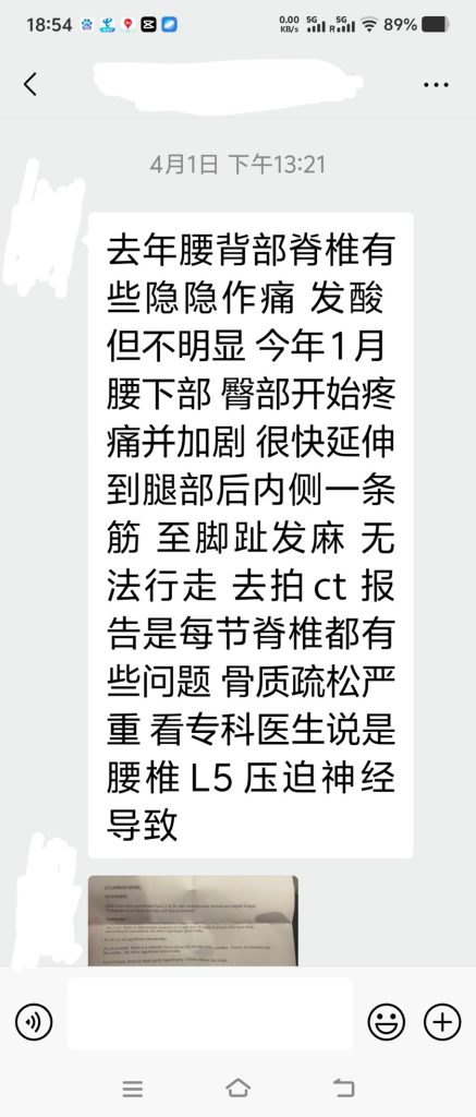 去年(2024年)腰背部脊椎有些隐隐作痛、发酸,但不明显今年1月腰下部、臀部开始疼痛并加剧,很快延伸到腿部后内侧至脚趾发麻,无法行走,拍CT报告是每节脊椎都有些问题,骨质疏松严重,看专科医生说是腰椎L5压迫神经导致。