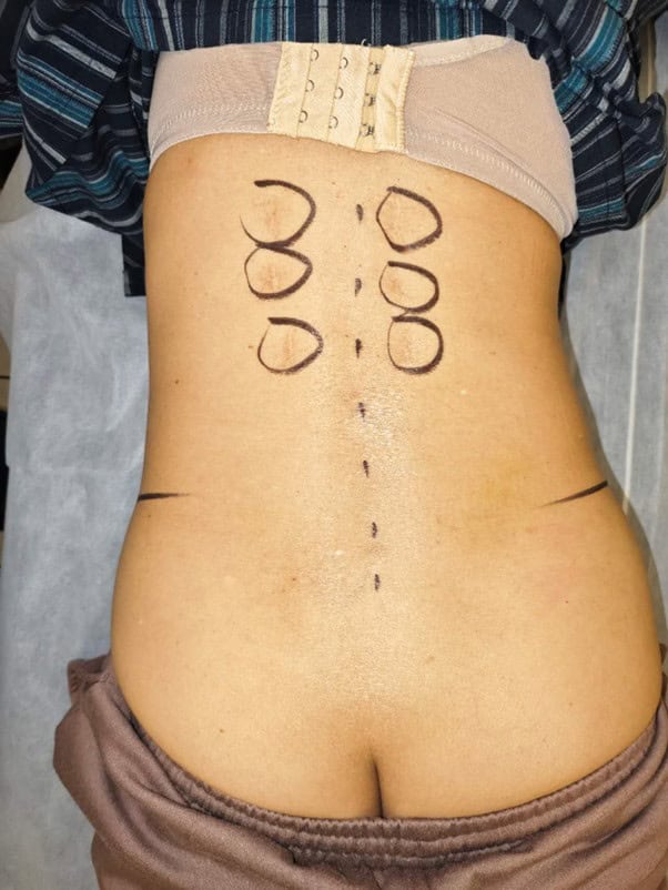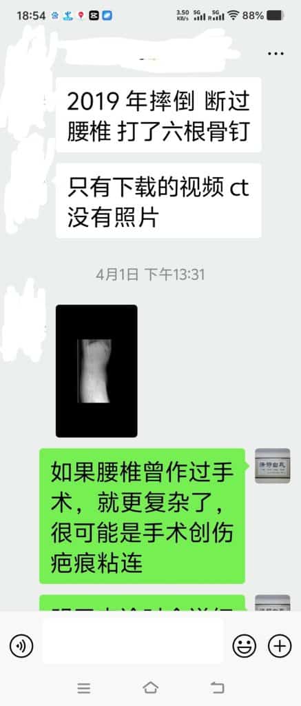 经问诊和详细检查后,知道病人在2019年摔倒致第一腰椎椎体压缩性骨折,经国内医生在第12胸椎和第1、2腰椎两侧横突打入共6支钢钉支撑压缩的第一腰椎椎体,病人诉述,手术后右腰臀部肿痛很严重,应该是手术时打入钢钉时有较多的出血,瘀血积聚在右腰臀部,压迫神经和附近软组织,并造成严重粘连,致腰臀部剧痛,牵扯致右下肢,而且越来越严重,影响行走。