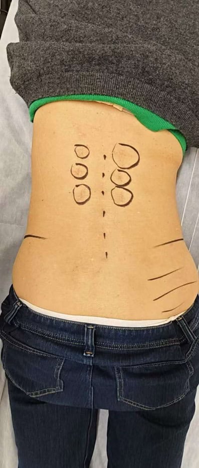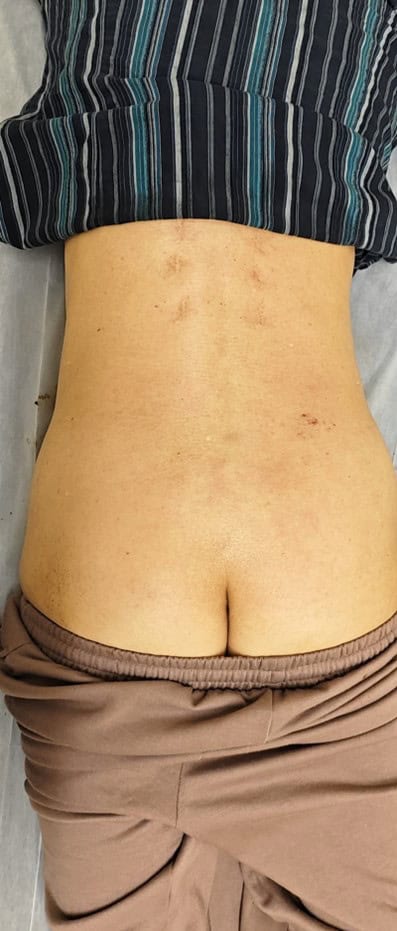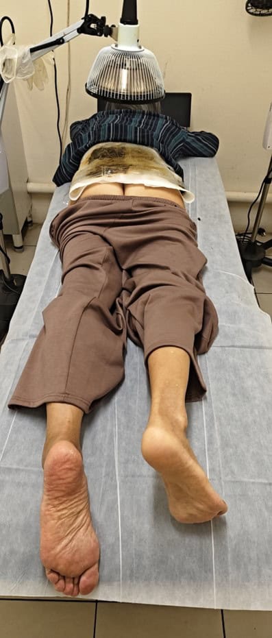 诊断明确后,施以我的“骨伤痛症深层疗法”,用我独有的“伤科止痛膏”外敷,以下是7/4/25第二次治疗时的照片,第一次来诊时,只顾著拍照腰椎侧弯和右腰臀肿胀的照片,没有拍摄治疗照片。