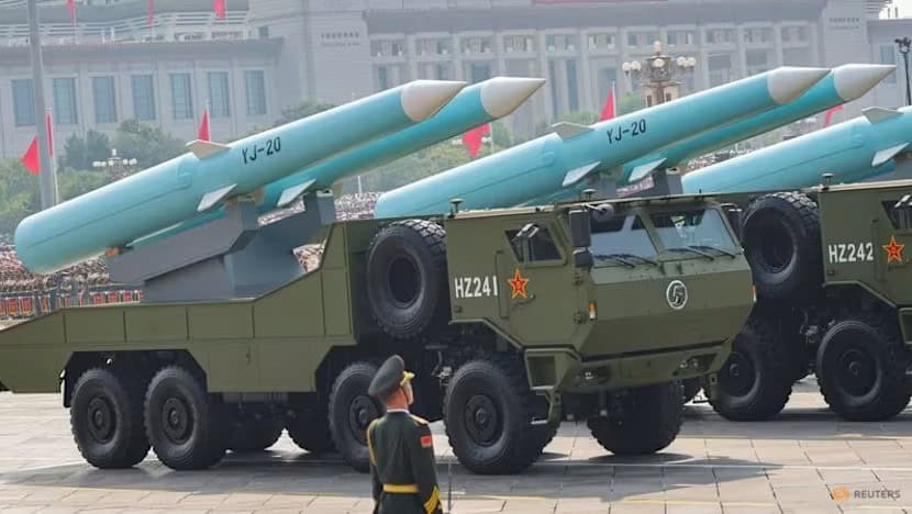 2025年9月3日,中国北京,纪念二战结束80周年阅兵式上,一名中国人民解放军战士站在海上作战小组展示鹰击-20高超音速反舰飞弹的现场(Reuters/Maxim Shemetov)
