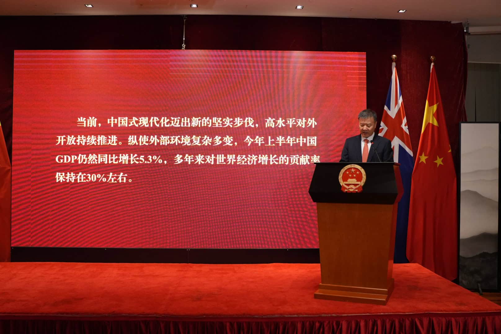 王愚总领事首先致辞,他回顾了新中国76年来的发展成就,强调中国在推进中国式现代化、科技创新及高水平开放方面取得的历史性突破。他指出,今年上半年中国GDP同比增长5.3%,继续为全球经济增长贡献约30%。中国持续推进新质生产力发展,在各个领域不断取得突破。