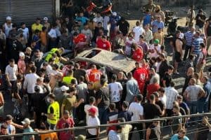 2025年7月8日,以色列空襲黎巴嫩北部的艾魯尼耶後,人們聚集在一輛受損汽車附近(Walid Saleh/Reuters)