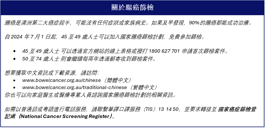 免責聲明:本文由澳洲政府國家腸癌篩檢計劃(NBCSP)及澳洲癌症協會(Cancer Council Australia)合作撰寫。所有重要資訊均來自官方活動網站,並以編輯語言表達。