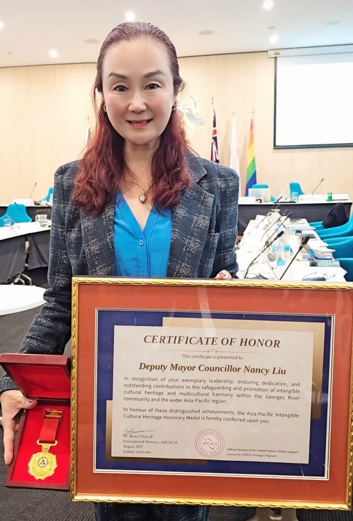 编辑:Editor乔治河副市长刘娜心议员(Councillor Nancy Liu)因其在推动多元文化及保护非物质文化遗产方面的贡献,荣获一项国际殊荣。亚太国际非物质文化遗产委员会(Asia-Pacific Council for International Intangible Cultural Heritage, APCIICH)授予刘副市长「亚太非物质文化遗产荣誉勋章」。