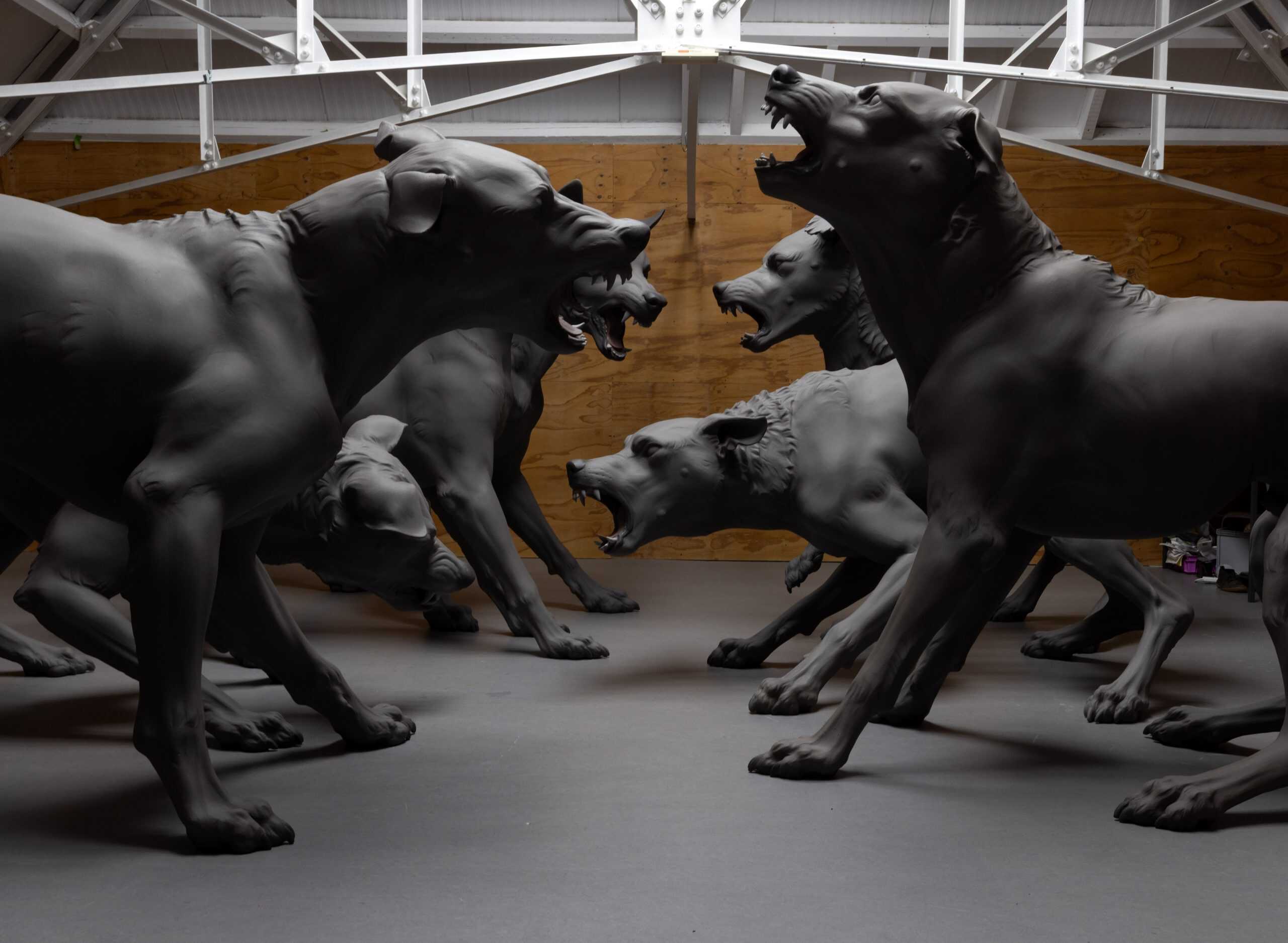 展覽核心將揭幕穆克為雪梨特別創作的全新沉浸式雕塑作品《浩劫》(Havoc, 2025)。這件巨大且充滿張力的作品,描繪兩群龐大犬類在戰鬥邊緣的瞬間,既神秘又令人不安,邀請觀眾進入一個直面恐懼與力量的場域。