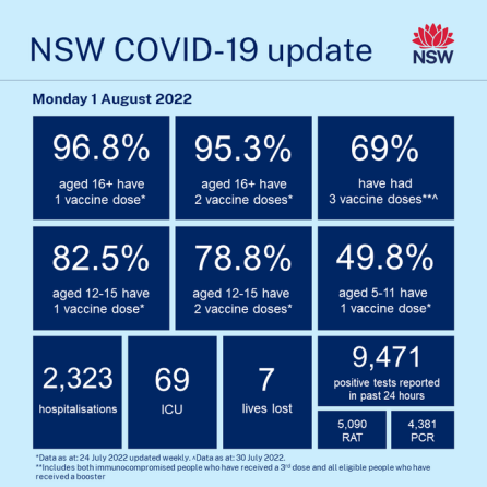 编辑:Editor据新州卫生厅今日公布数据显示,在截至昨天下午4点的过去24小时内,新州新记录9,471宗新冠病毒本地确诊个案,7人不幸病亡。在今日新增确诊中5,090宗为快速抗原检测(RAT)上报个案,4,381宗为PCR检测阳性个案。2,323人住院治疗,其中69人在ICU。截止目前,新州16岁以上人口的第一剂疫苗接种率达到96.8%,两剂疫苗接种率为95.3%,第三针疫苗接种率上升至69%。 在12至15岁青少年人群中,82.5%的人已接种第一剂疫苗,78.8%的人完成两剂疫苗接种,在5-11岁的儿童中,49.8%的人已接种第一剂疫苗。