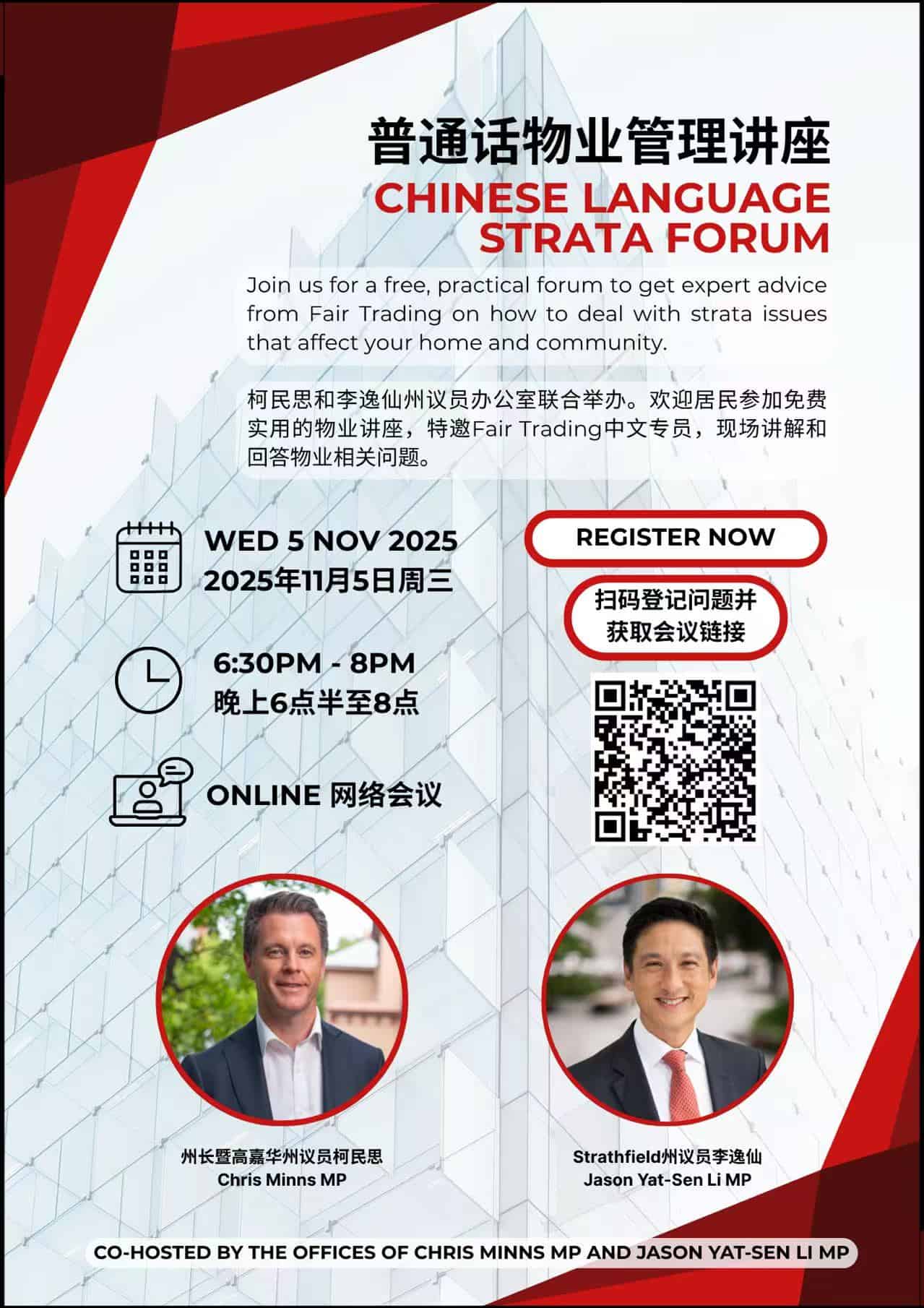 11月5日周三晚上,柯民思州议员办公室和李逸仙州议员办公室将联合为华人居民举办一场中文普通话物业管理讲座。他们将邀请会讲中文普通话的新南威尔士州公平交易(Fair Trading)专员,讲解物业相关知识,现场解答观众提交的问题。