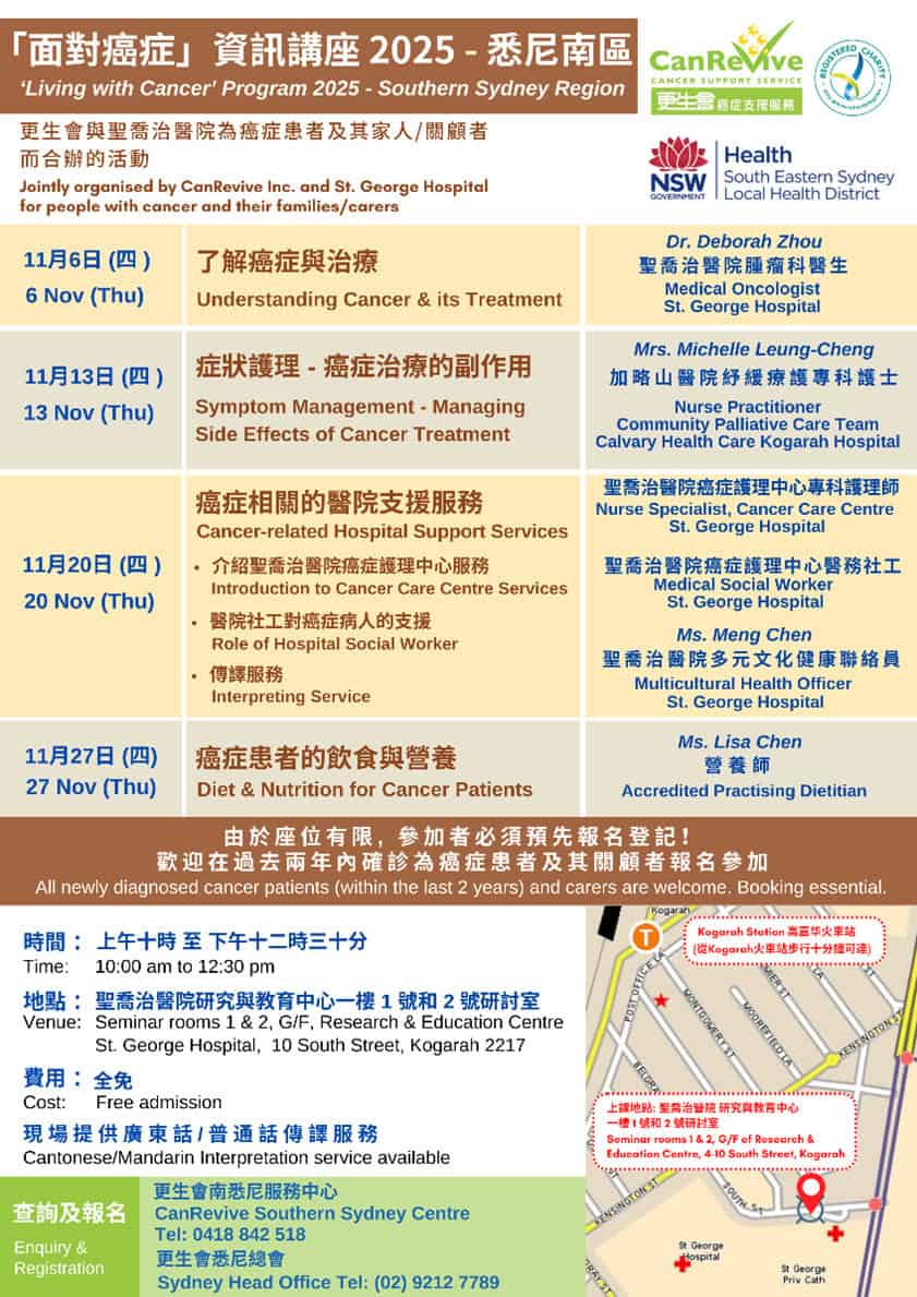 更生会与圣佐治医院 (St George Hospital) 将于本年11月份联合举办为期四讲的「面对癌症」资讯讲座,目的是为华裔癌病患者及其家人提供有关面对癌症的实用资料和讯息,帮助患者及其家人积极面对癌症。