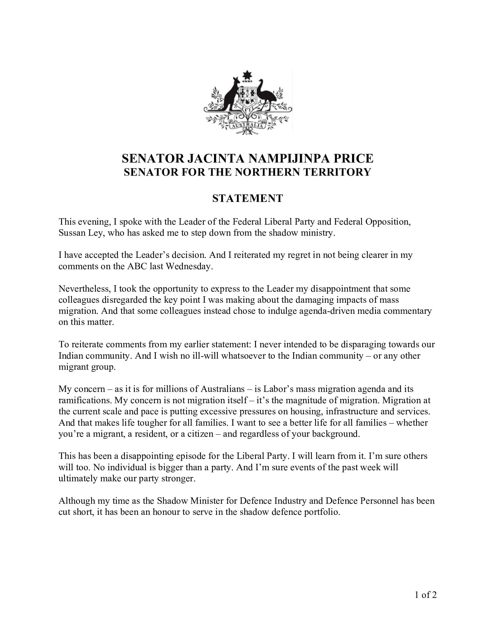 編輯:Editor以下是澳洲北領地參議員 Jacinta Nampijinpa Price 於2025年9月10日發表的聲明: