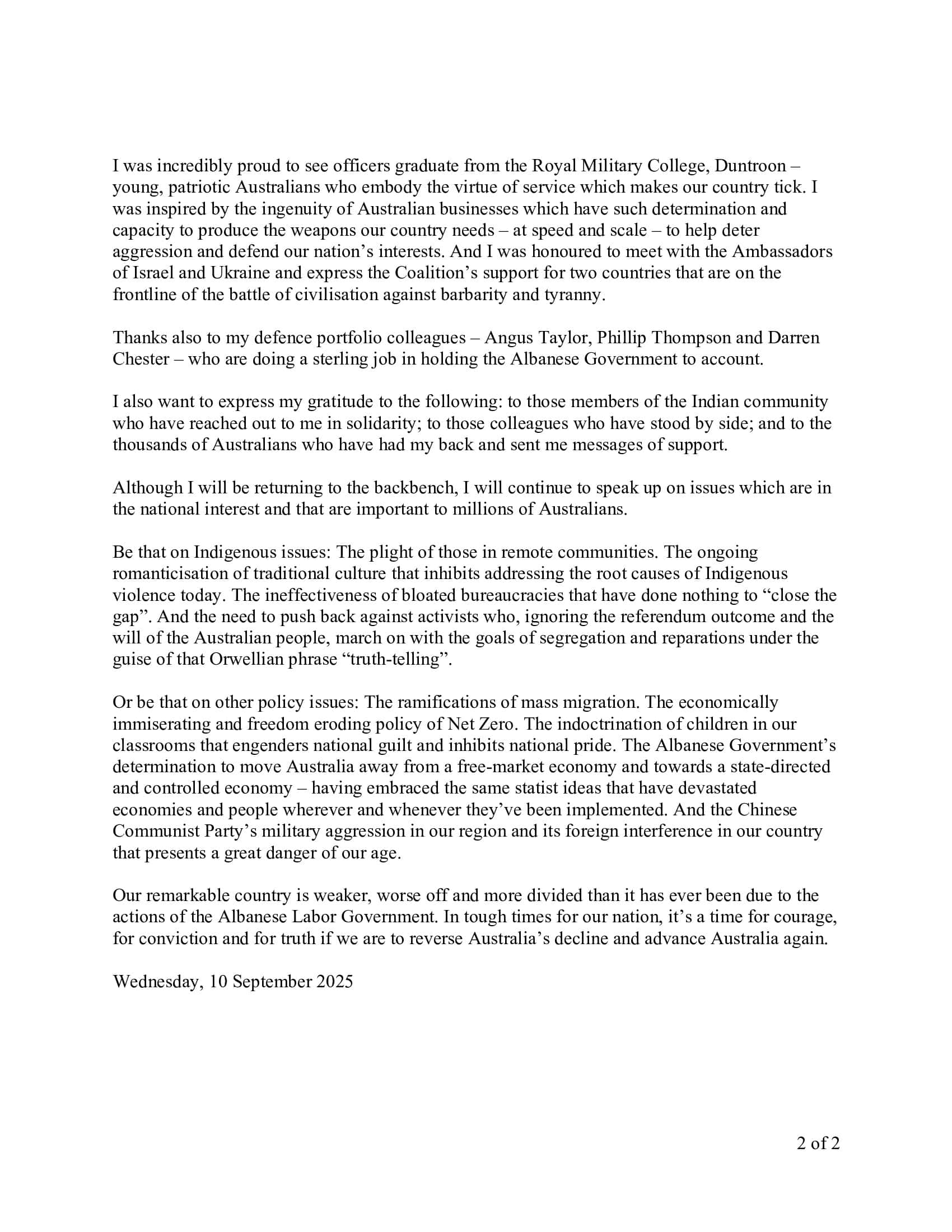我為能親眼見證 Royal Military College, Duntroon 的軍官們畢業而深感自豪——他們是年輕、愛國的澳洲人,體現了支撐國家運轉的「服務精神」;我也被澳洲企業的創新精神所激勵——他們展現出決心與能力,以高速與規模生產我國所需的防衛武器,來遏制侵略並捍衛國家利益;我也很榮幸能與 以色列 與 烏克蘭 大使會面,向他們表達聯盟黨對這兩個正站在文明與野蠻暴政戰線上的國家的支持。