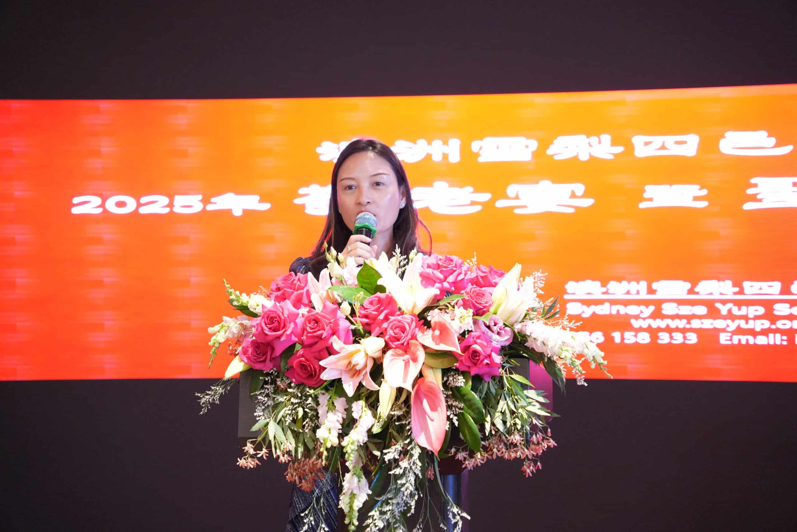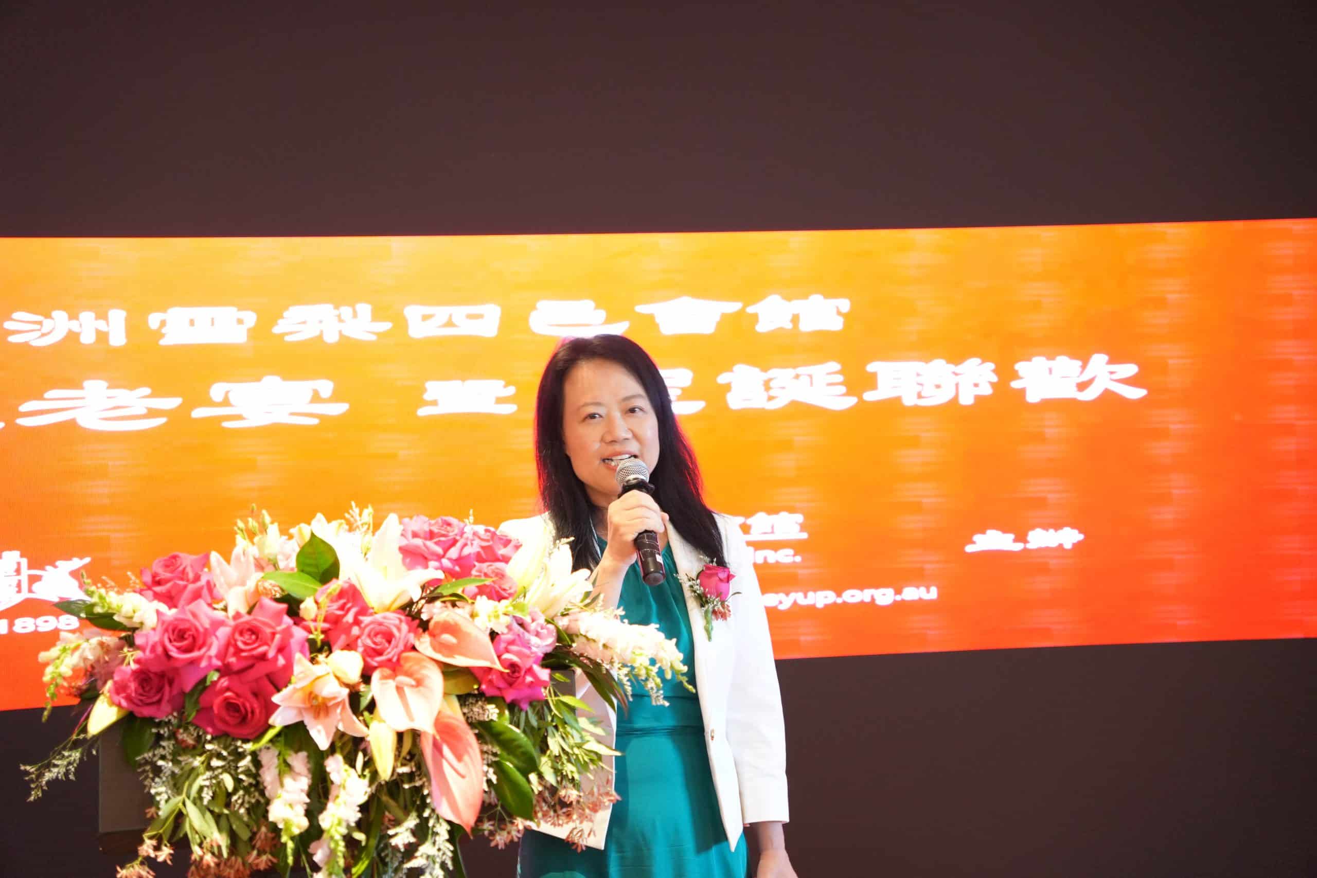 喬治河市市議員劉娜心致辭表示,非常高興能出席並笑言,今天在現場看到許多熟悉的面孔與鄉親長輩,倍感親切與溫暖。她指出,四邑僑社在澳洲已有超過 171 年的歷史,是所有廣東籍社團中最早成立、歷史最悠久的組織之一,她感謝前輩們的奮鬥與奉獻。