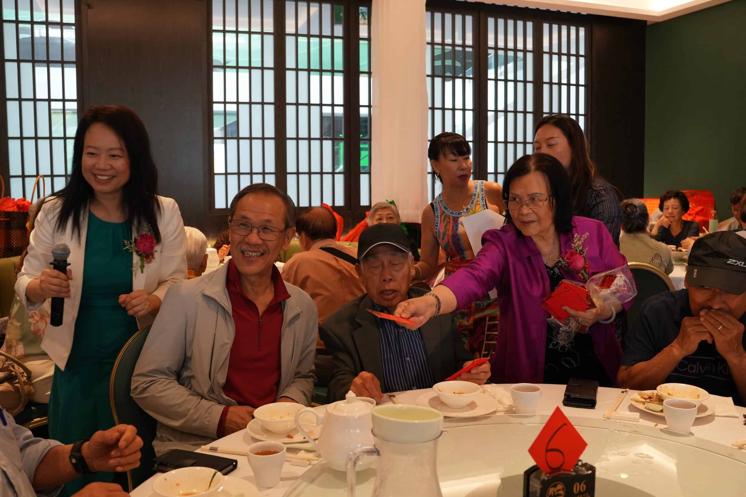 其後,大會特別舉行 80歲及90歲以上長者派發紅包儀式,由張靖楠會長、李嘉熹副會長、蘇張艶影委員親手贈送,表達對長者的祝福與敬意。眾長者臉上洋溢笑容,氣氛感人熱烈。
