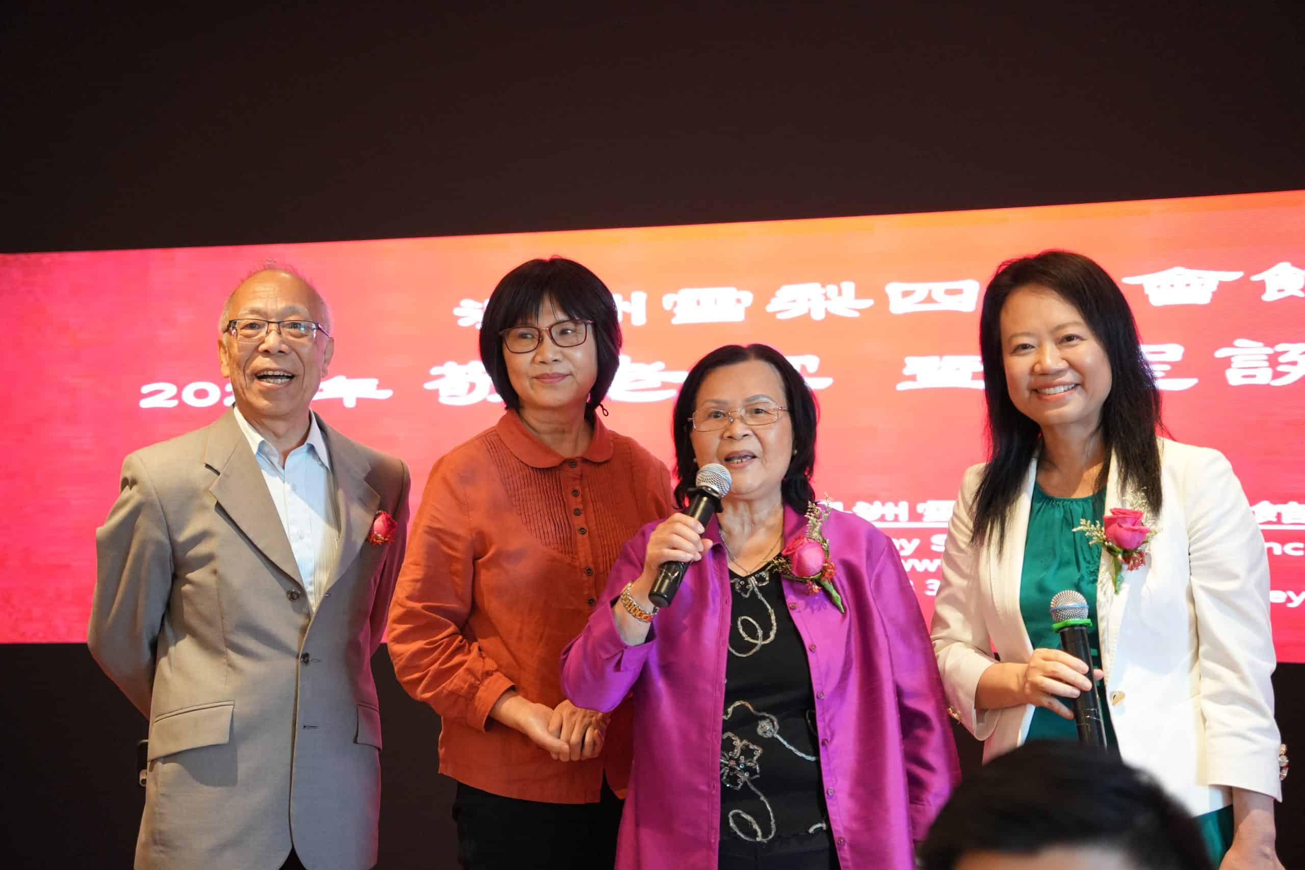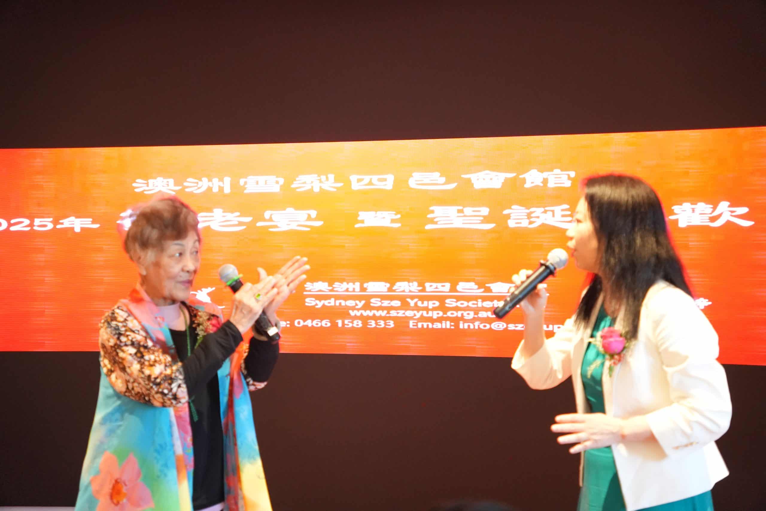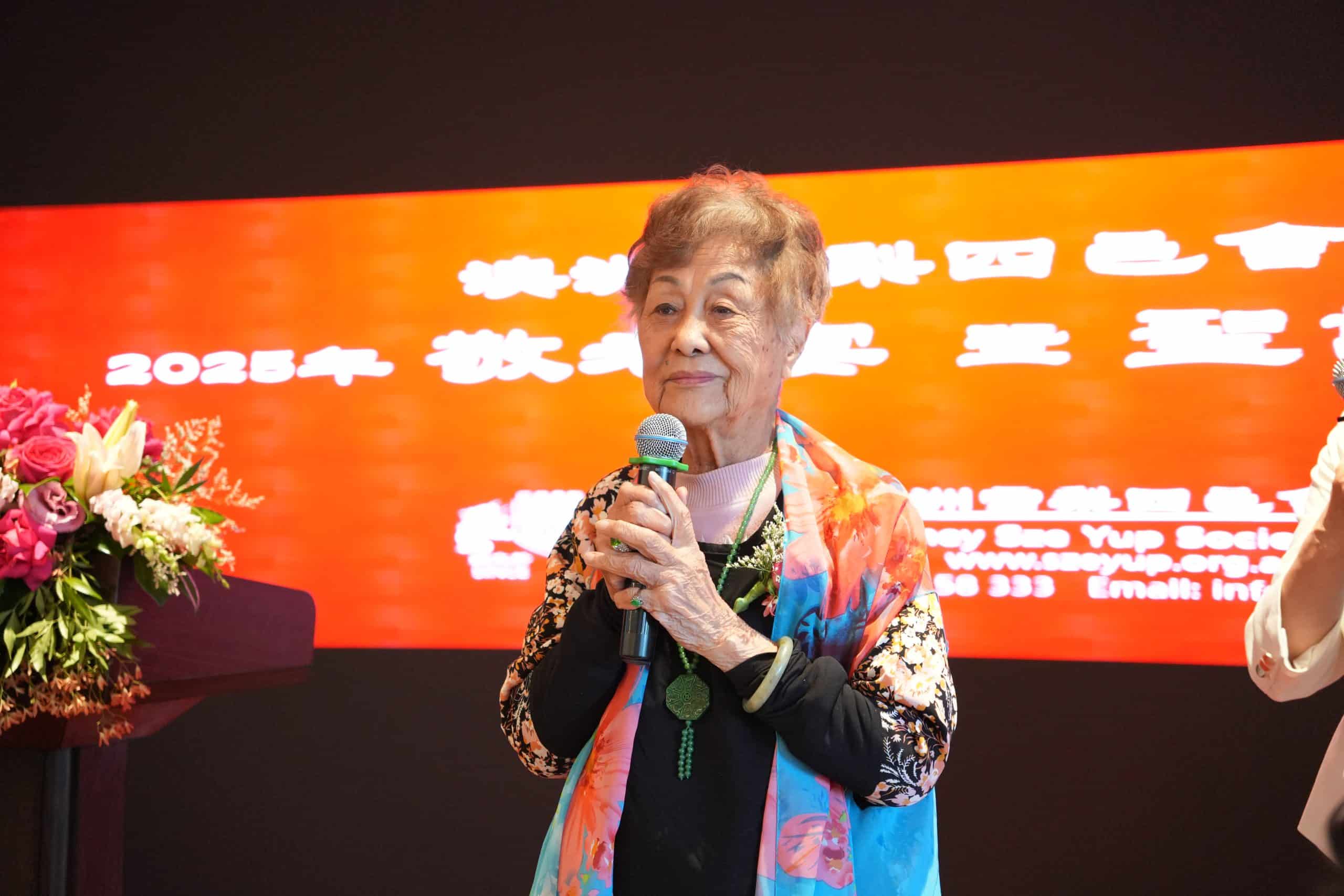 現年 94 歲的粵劇名伶李鳳聲女士(香姐) 在活動上即席發言,精神奕奕地向全場長者與鄉親致以問候。李鳳聲回顧自己在澳洲生活數十年的經歷,表示多年來一直致力於推廣 粵劇與粵曲文化,希望讓年輕一代了解和欣賞這門傳統藝術。她特別感謝歷年來支持粵劇發展的鄉親與觀眾,並提到多年來與多位同好,如「阿琴姐」、「咪咪姐」等,一同努力傳承文化,情誼深厚。她說,隨著年歲漸長,如今難得有機會在敬老宴上與眾多舊友重聚,內心倍感溫暖與感動。最後,她感謝四邑會館多年來舉辦敬老宴,讓長者們能夠「開開心心、一齊相聚」,也祝願大家健康長壽、幸福滿滿。