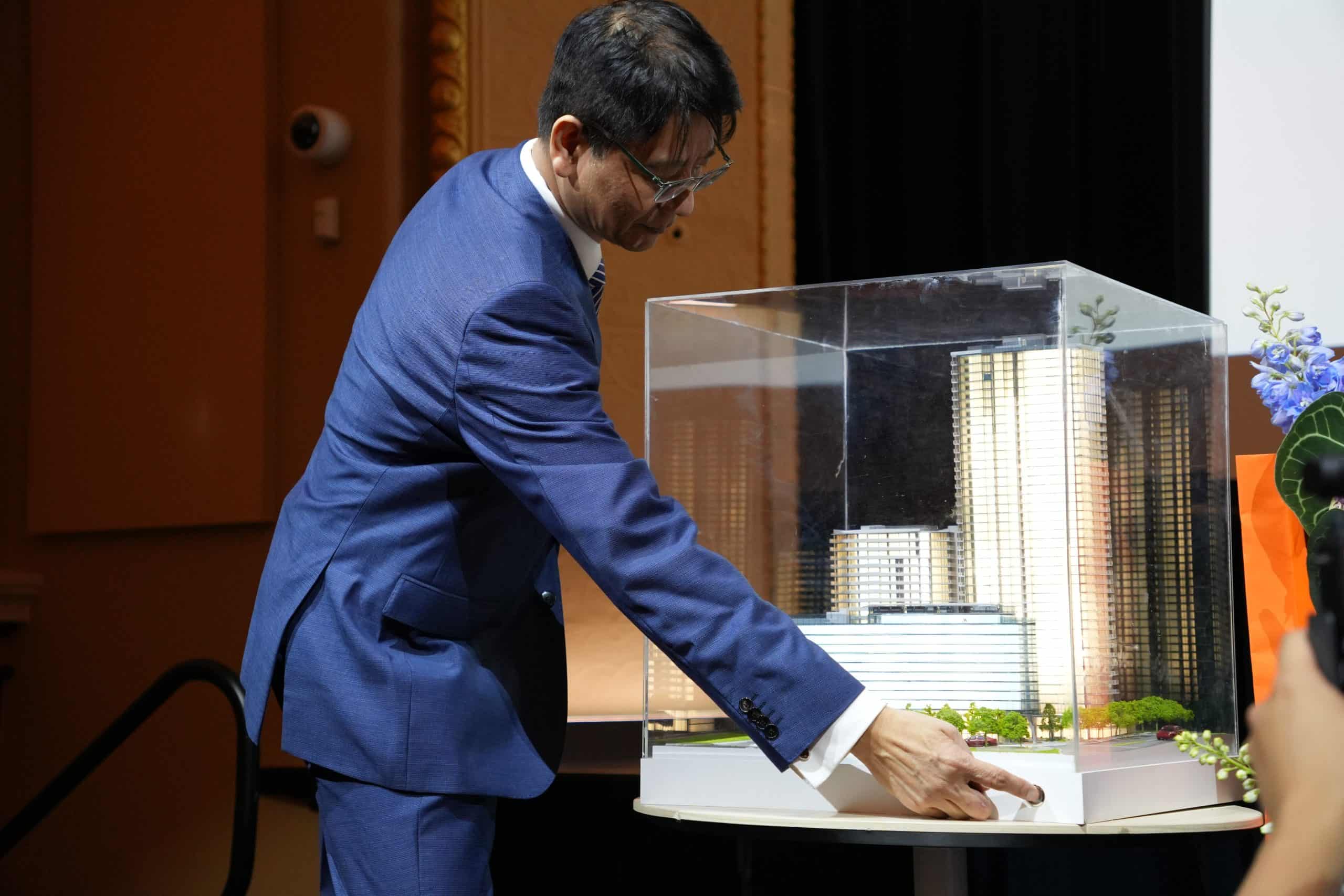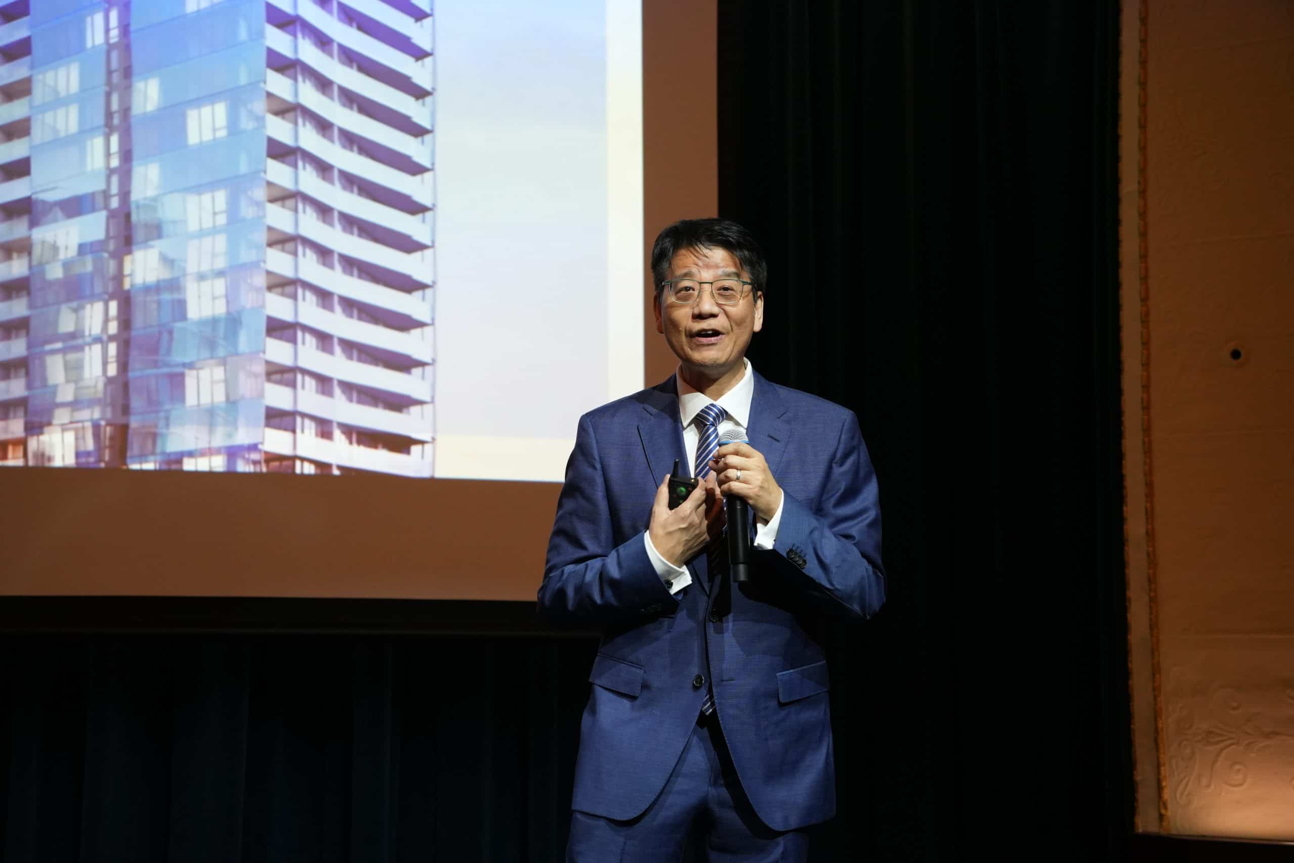 在影片之後,澳洲鼎豐集團主席 Denis Wan 登台發表演講,表示能在 One City Square 亮燈儀式上與各界嘉賓分享市場觀察感到非常榮幸。他回顧自己在房地產行業三十年的經驗,並指出以工程師出身的專業背景,始終希望讓建築設計更貼近社區需要,創造兼具活力與品質的環境。