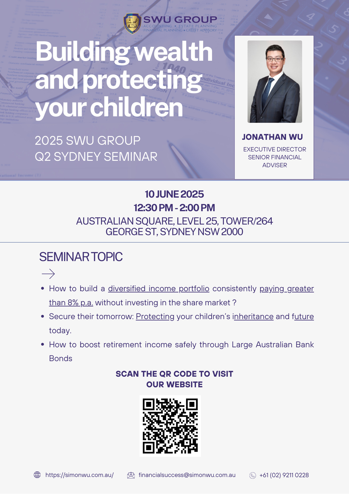 由會計理財師胡嘉龍先生和胡善文先生擔任嘉賓主持,為聽眾分析時下世界大事如何影響到現今經濟格局和大家的日常財務狀況。更針對澳洲華人的不同群體和需要,介紹合適的金融投資產品,以及關於稅務、房地產、退休儲蓄等的資訊。每週針對經濟領域的不同時間,深度分析經濟事件的影響,提供新的認知方式和角度,幫助聽眾對經濟格局有更全面的了解,對經濟事件有更立體的認識。擁有超過25年理財經驗的胡嘉龍先生用深入淺出的方式,為您講述財經動態,讓即使沒有受過系統財經知識培訓的聽眾亦能理解學者的專業意見,是適合普羅大眾收聽的財經節目。節目更針對澳洲華人的各個群體及需要,介紹合適的金融投資產品,以及關於稅務、房地產、退休儲蓄等的資訊。從澳洲走向世界,為您提供更獨到、更前瞻的高度與觀點。
