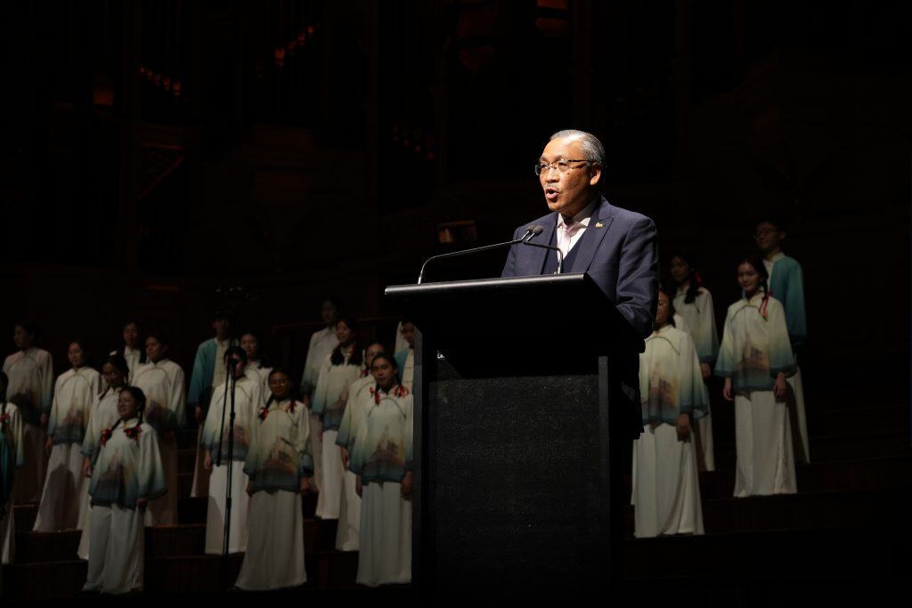 隨後,香港兒童合唱團前董事會主席任德煇亦代表合唱團致辭,向更生會在整場活動上的周詳安排表達感謝,並對經貿辦的資助與支持致以謝意。他表示,距離2017年上次訪澳已經八年,非常高興能再次踏上澳洲的舞台,並與悉尼的朋友們分享音樂與歡樂。任德煇亦指出,合唱團上週才剛在塔斯馬尼亞霍巴特參加「Festival of Voices」音樂節,能夠繼續在悉尼展開此意義非凡的文化交流,感到十分榮幸。