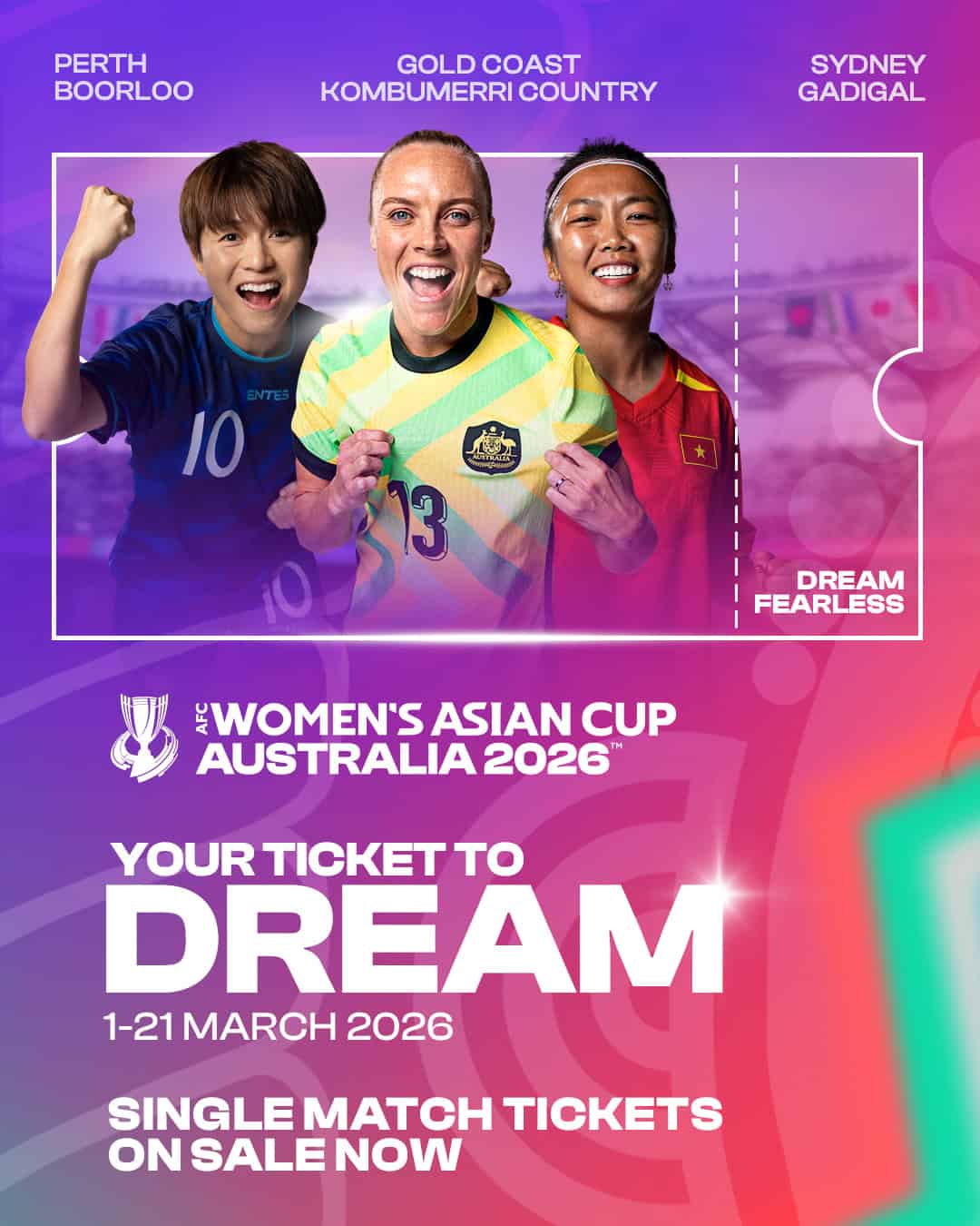 門票成人只需 20 澳元 起,兒童只需 10 澳元起*,是家人與朋友相約同樂、參與這場亞洲最大女子足球盛會的絕佳機會!