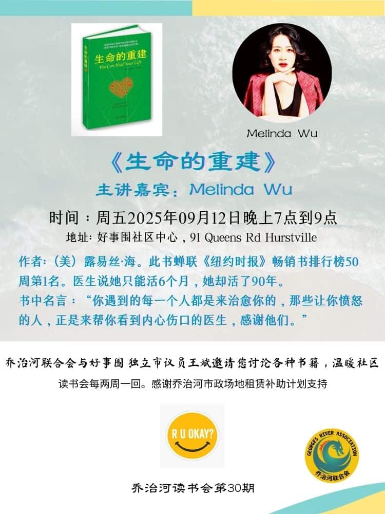 9月12日周五晚7-9点,读书会将继续在好事围社区中心(91 Queens Rd, Hurstville)举办第30期活动,聚焦心灵疗愈经典《生命的重建》。本书作者、传奇心灵导师露易丝·海曾用自愈信念战胜癌症,其作品高居《纽约时报》畅销榜50周榜首,全球影响超5000万人。本期将深入探讨如何通过心理学与灵性实践破除自我限制、运用肯定语唤醒内在力量,引导参与者面对情绪困扰、实现自我和解。欢迎居民免费参与。